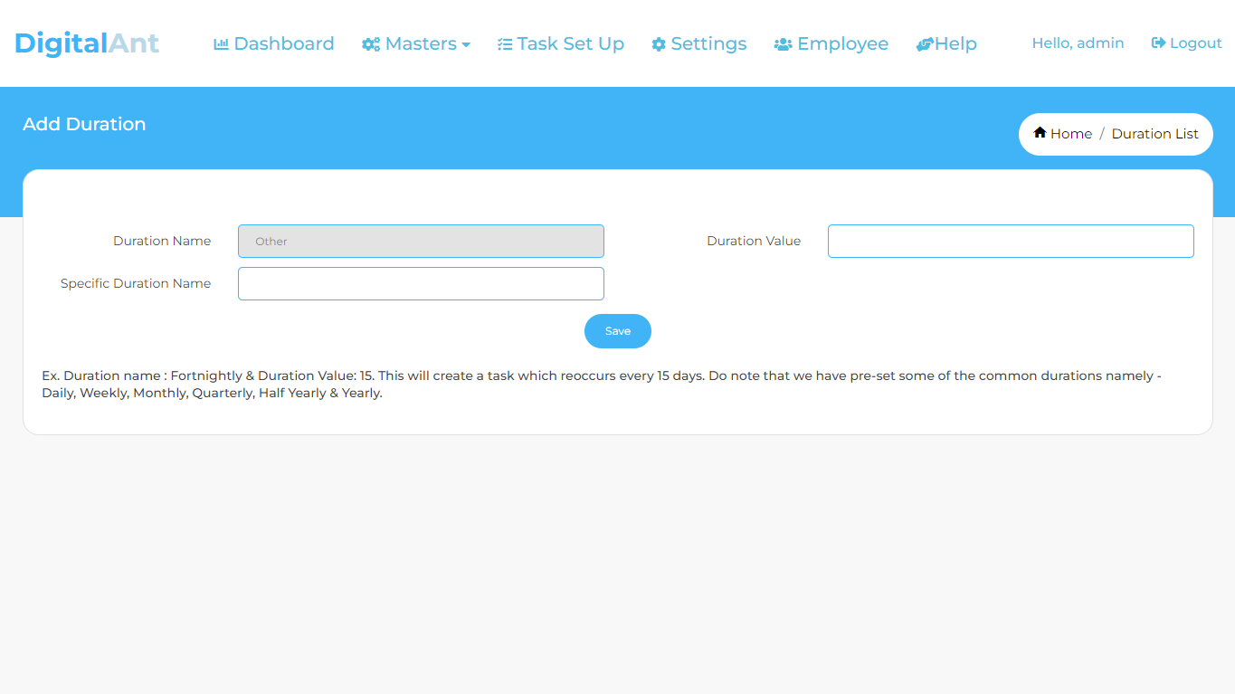 Duration decides the frequency of performing any particular task. We capture all possible duration values in Duration module with standard duration values already defined.Though the tool does allows you to create your own custom duration cycle