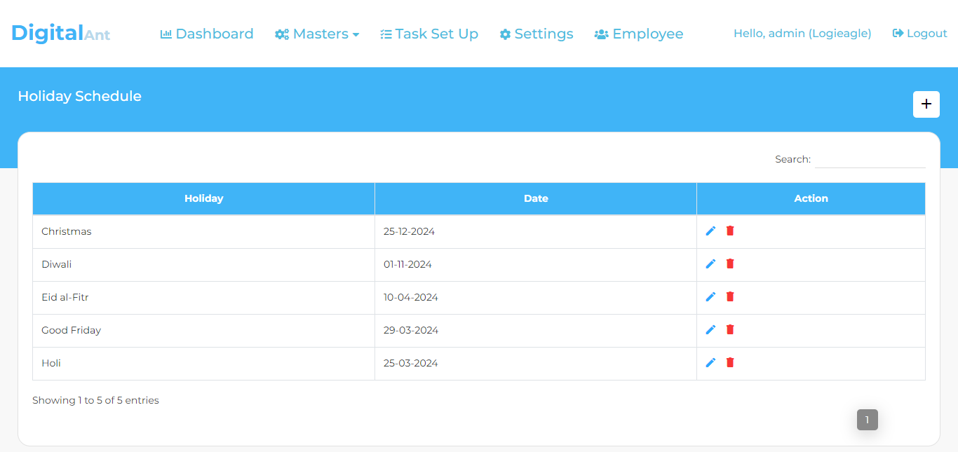 Add details of holiday schedule followed by your company. While managing tasks, its important to know before hand the teams availability. Holiday schedule will help task scheduling tool to schedule any tasks on a potential holiday.